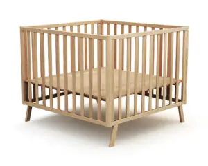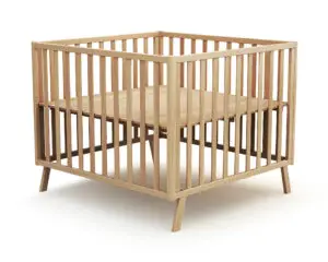 Un parc en bois évolutif qui devient une véritable aire de jeu ouverte sur l’extérieur lorsque bébé grandit.