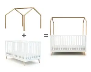 Un petit toit tout mignon adaptable sur le lit bébé KASA 60x120cm pour qu’il devienne une jolie cabane pour bébé.