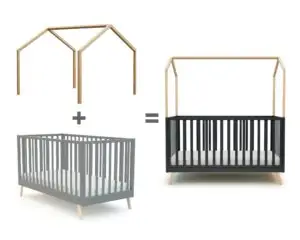 Un petit toit tout mignon adaptable sur le lit bébé KASA 70x140cm pour qu’il devienne une jolie cabane pour bébé.
