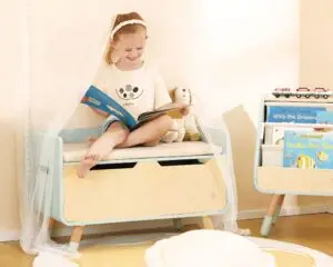 Ce meuble 2-en-1 pratique et élégant permet de garder la chambre en ordre tout en offrant une assise confortable pour les moments de jeu ou de lecture.