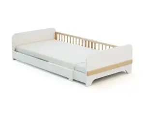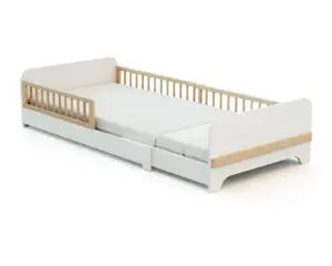 Sa structure coulisse pour un couchage de 140 cm, 165 cm ou 190 cm de longueur et sa petite barrière de protection peut être retirée lorsqu’elle ne sera plus utiles.