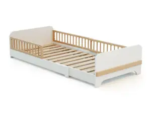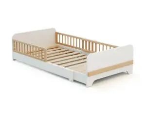 Un lit au sol accessible et sécurisé dont la longueur s’adapte à la croissance de votre enfant grâce à son sommier extensible !