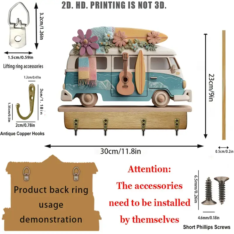2D Plat, 2D Plat Bois Multi-Fonctionnel Porte-Clefs avec Quatre Crochets en Métal pour Décoration Murale, Décoration de Porche, Décoration de Chambre, Décoration de Villa, Décoration de Maison Toutes Saisons – 29,97 cm x 22,86 cm,